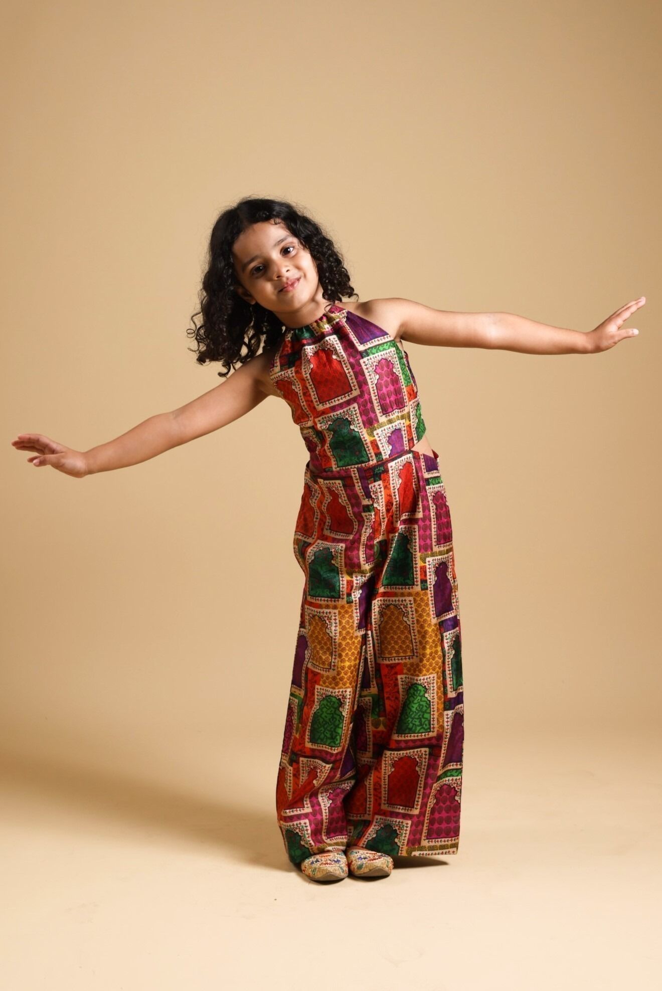 A stylish halter neck jumpuit featuring side cut-outs, centre back concealed zipper, and side pockets, adorned with a vibrant Jharoka print that blends traditional elegance with modern design. Crafted for a relaxed fit, it ensures easy movement and all-day comfort for active girls.