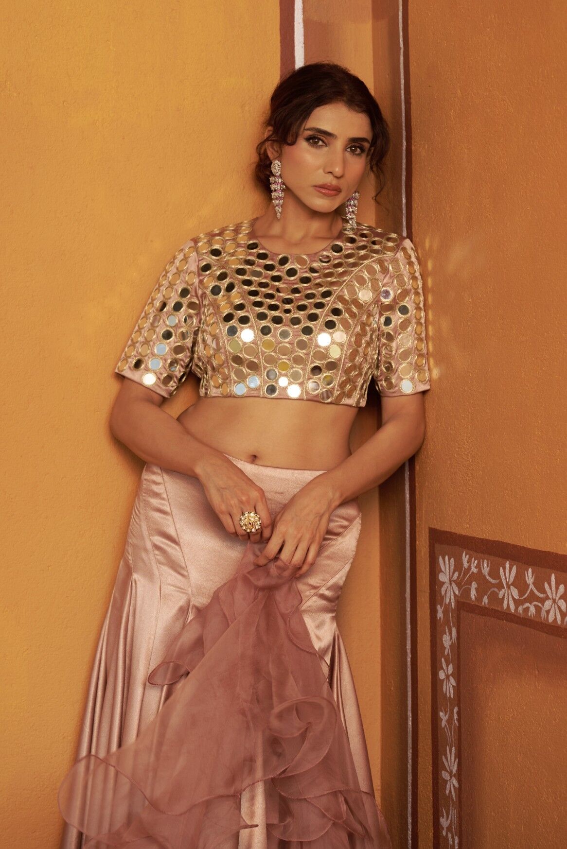 | Design Style | Fully Hand-Embroidered Mirror Work Blouse with Blush Pink Kalidar Lehenga & Ruffle Dupatta |