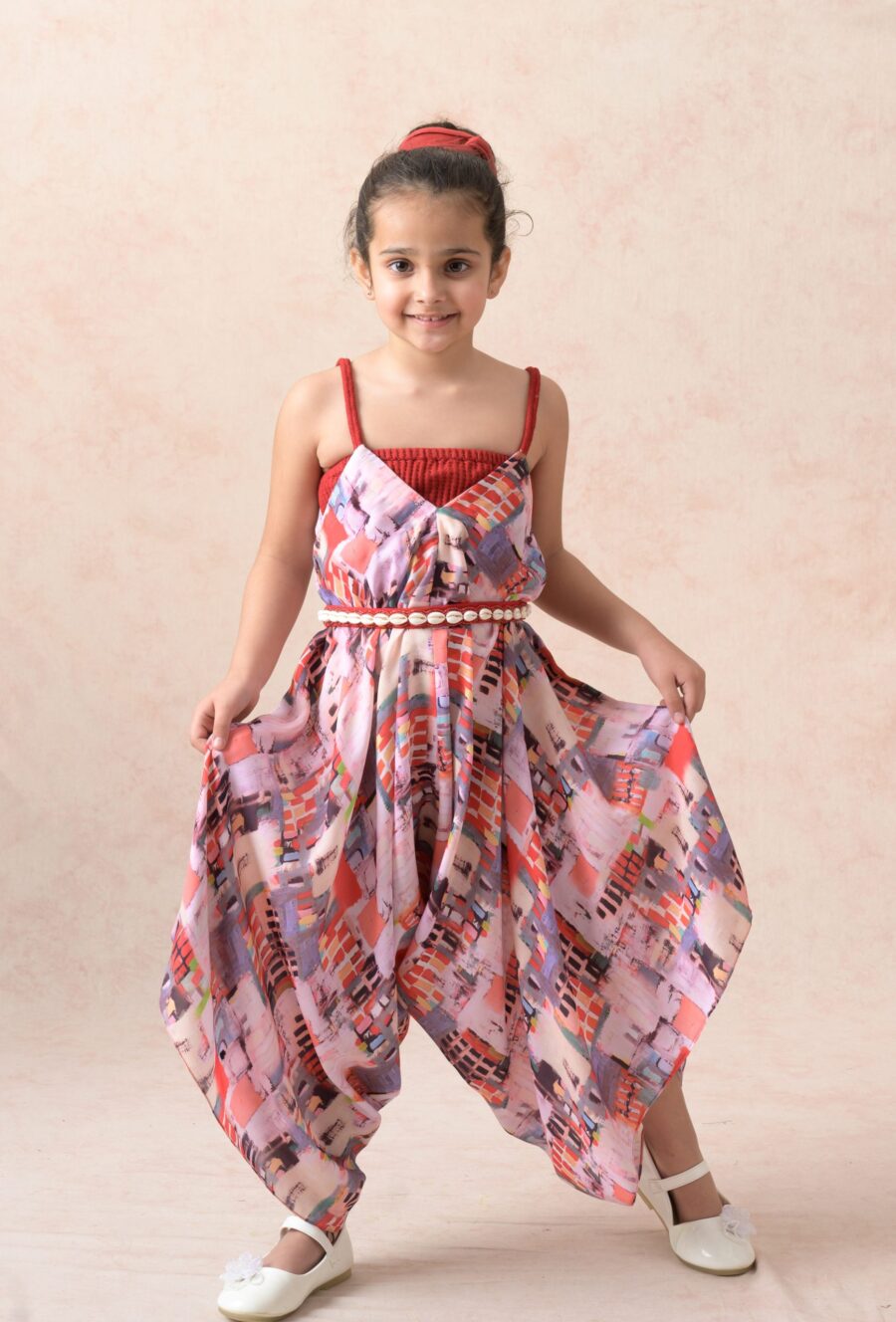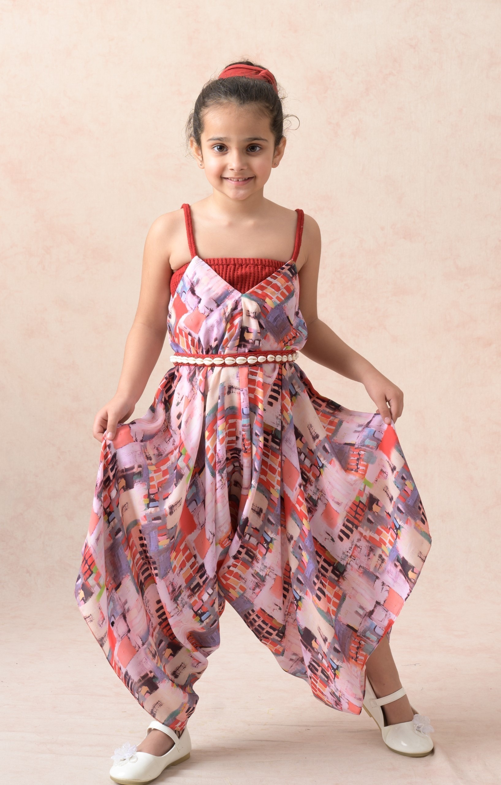 A playful and stylish ensemble, this Spanish-style jumpsuit features an abstract multicolour print with braided straps and a flared asymmetric hem. Comes with a solid red knitted stretchable tube and a handcrafted embroidered seashell belt to complete the look. Designed with hidden inside finishing, it ensures comfort while celebrating vibrant style. The jumpsuit is size-inclusive, making it a versatile choice for children.
