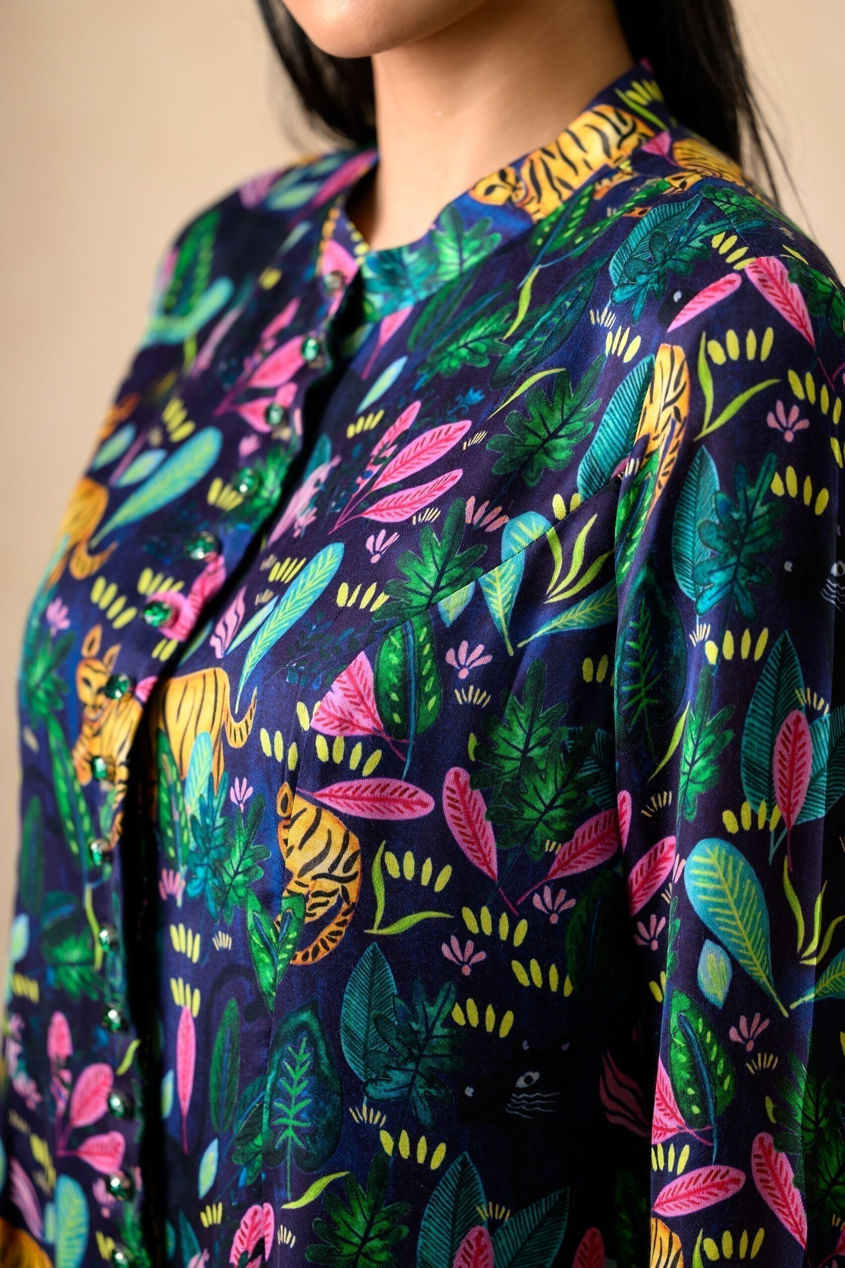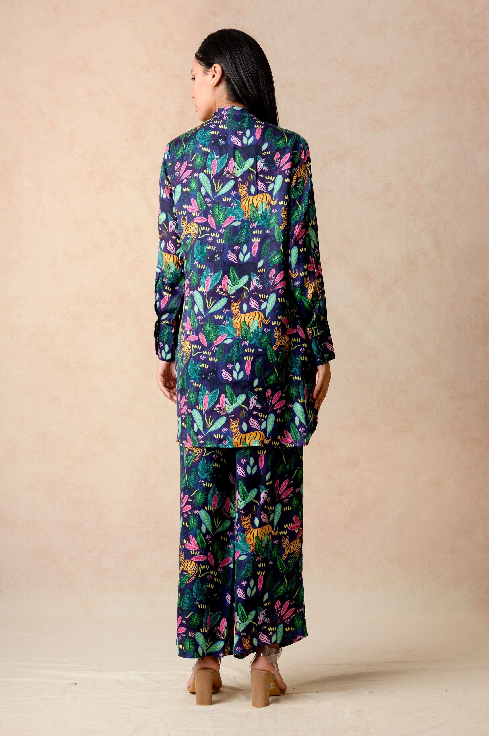 A statement-making coord set in a modern royal blue jungle print with purple tones, featuring stone embellishments on the button placket and broad cuffs. The palazzo pants are designed with a side zipper and back elastic for a perfect waist fit, while both pieces are finished with breathable fabric lining for comfort. With refined craftsmanship and generous margins for adjustments, this ensemble blends glamour with effortless wearability.
