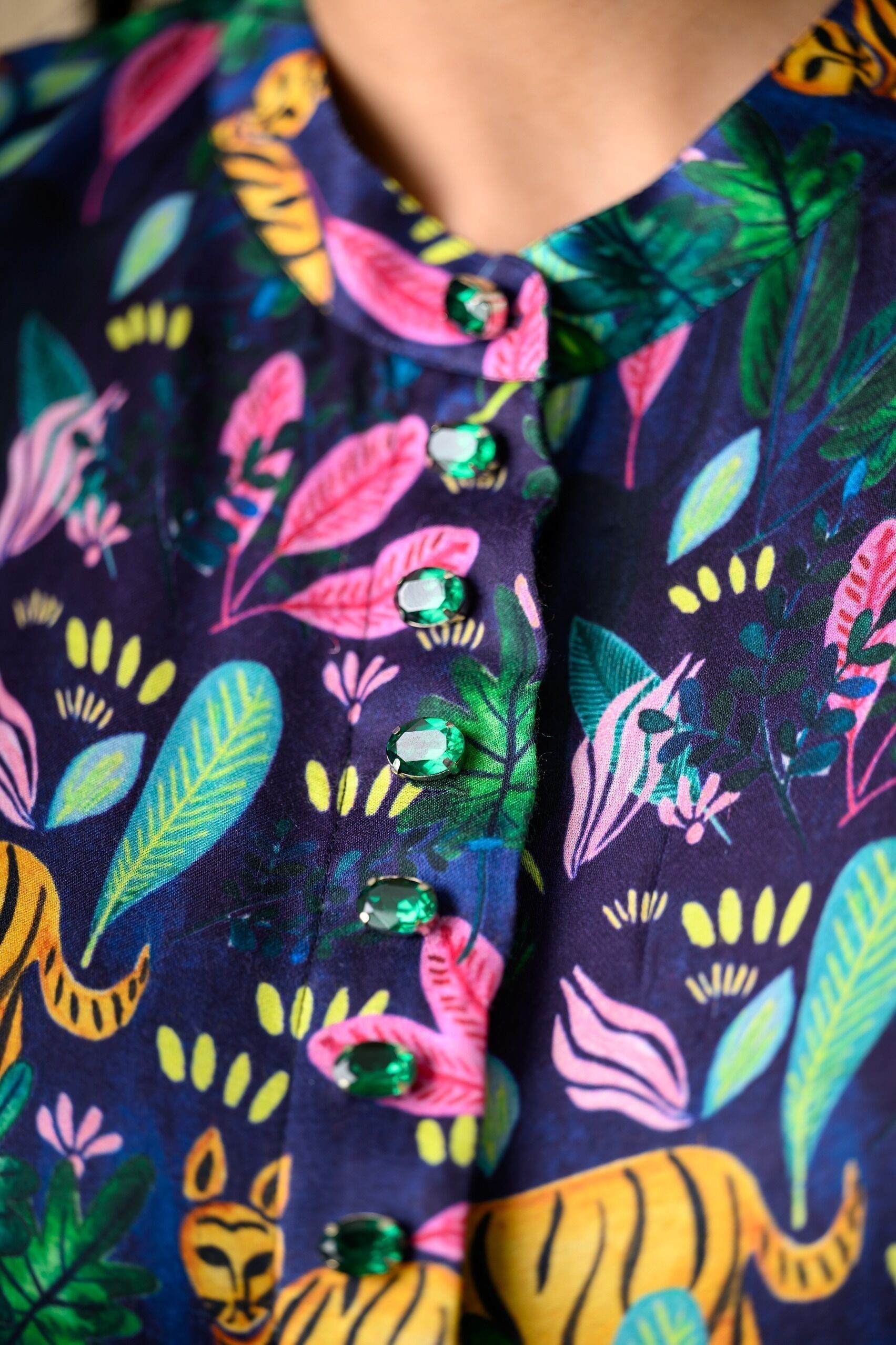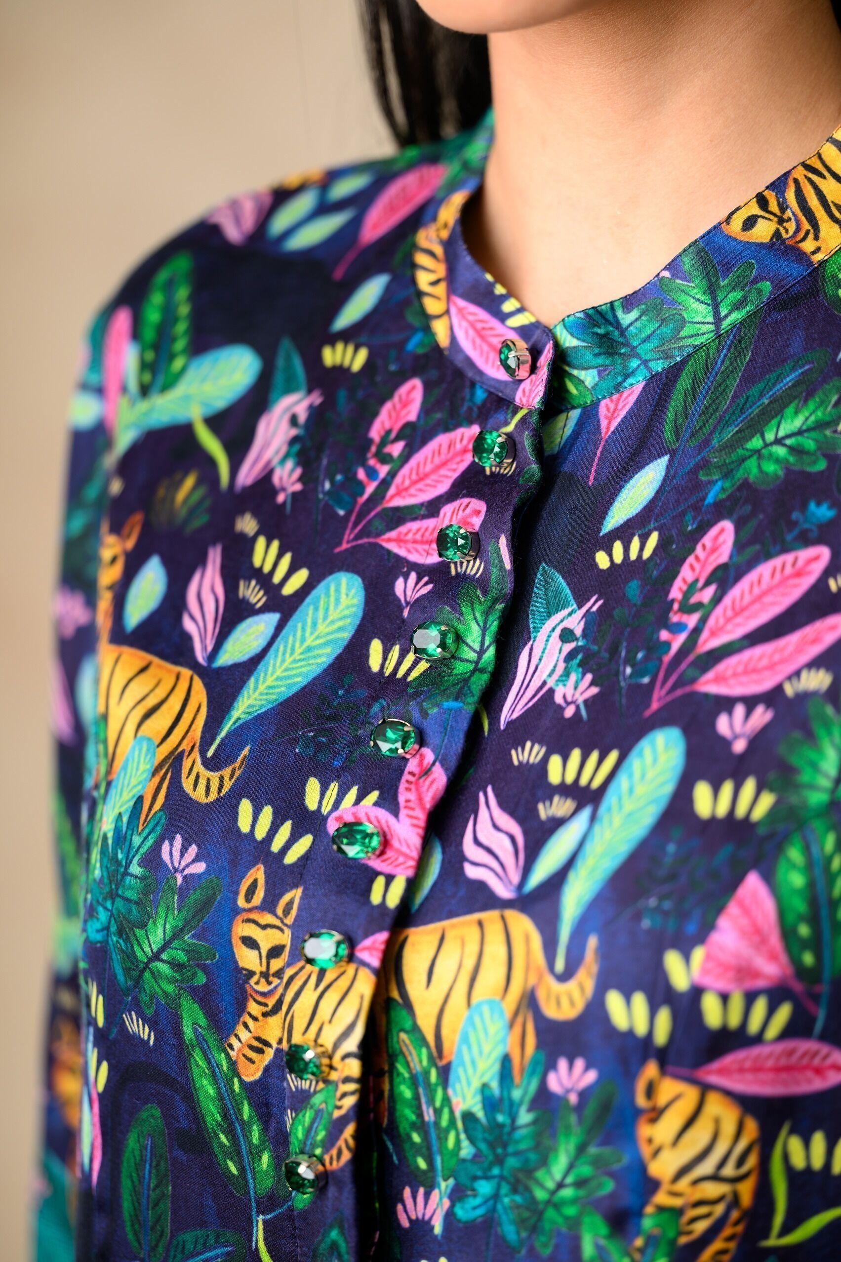 | Top Design | Royal blue jungle print shirt with tones of purple, front button placket & broad cuffs with stone embellishment |