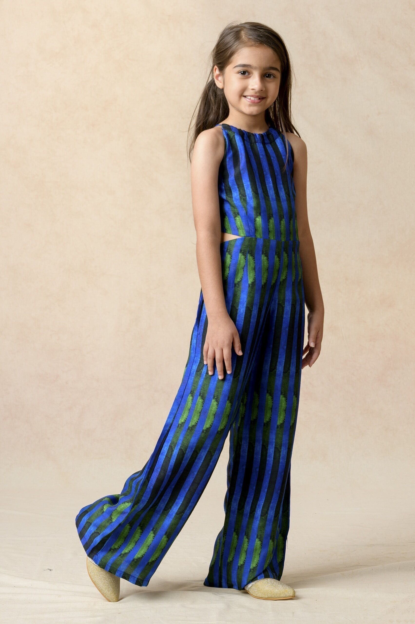 Beautiful blue green watercolor effect (copyright print) printed jumpsuit with side cuts and full back concealed zipper
