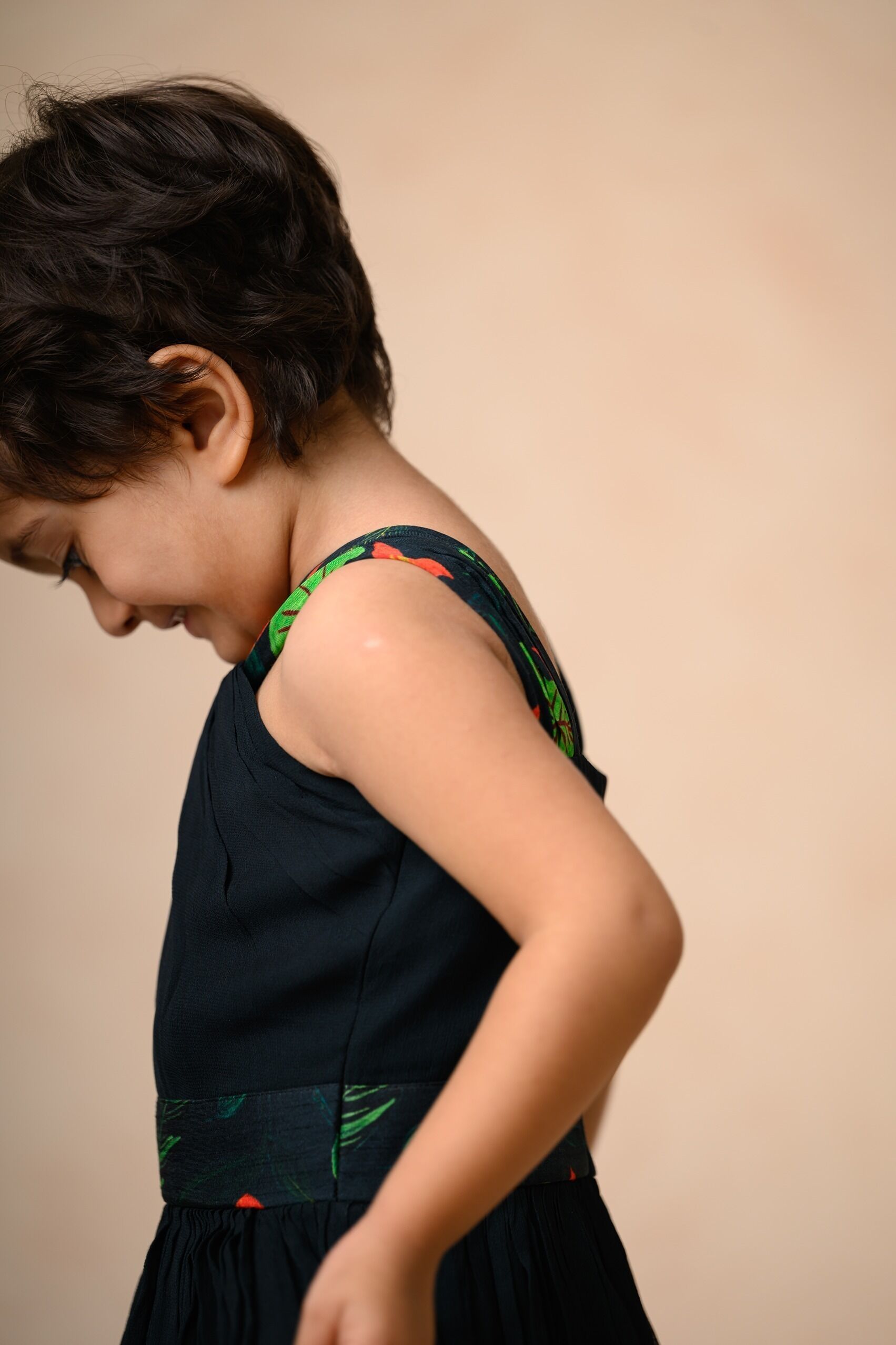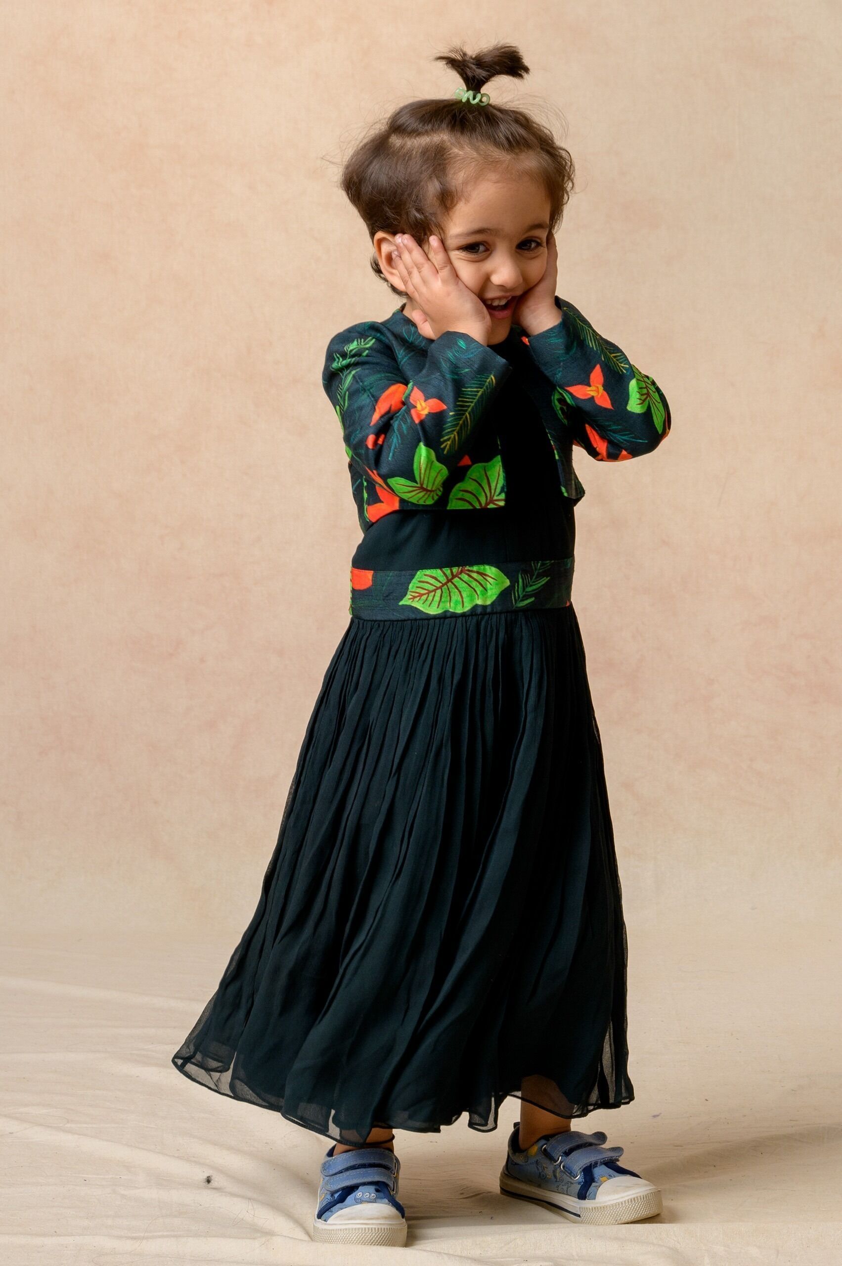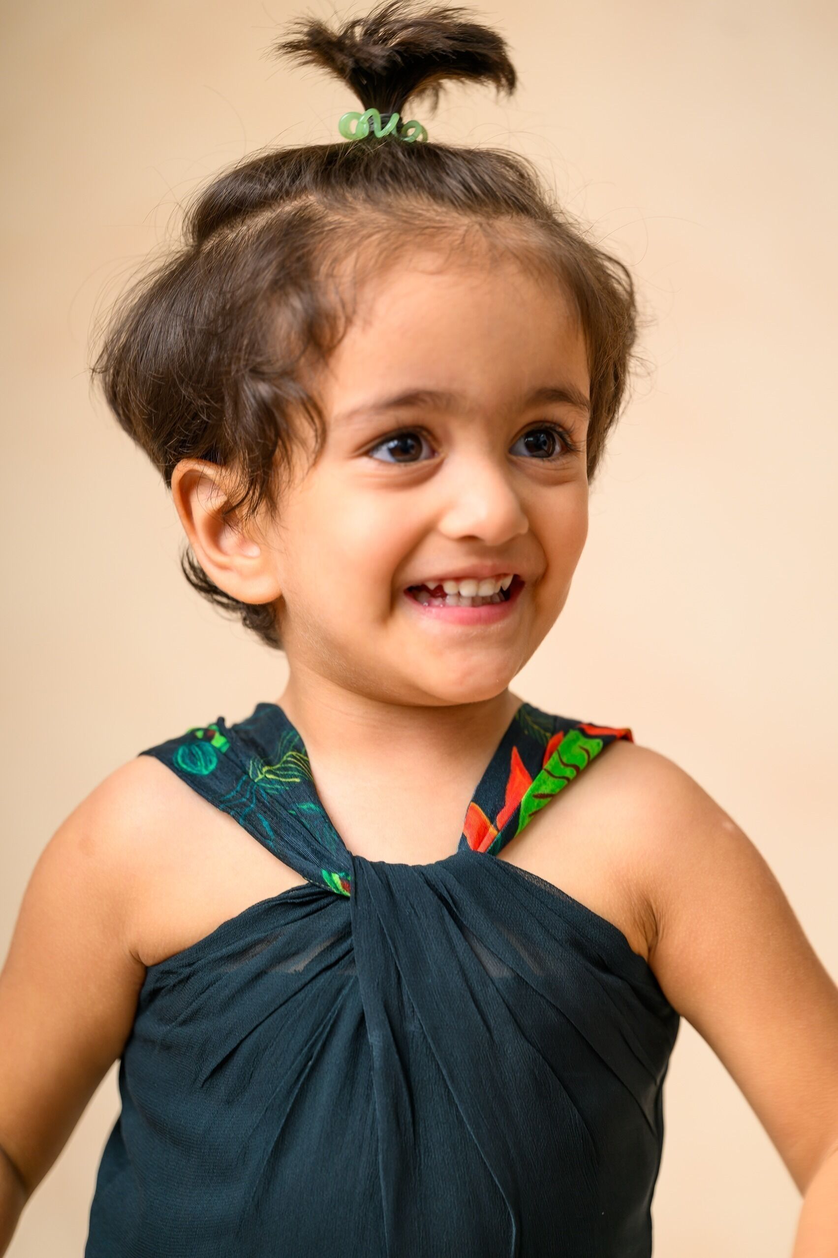 A charming georgette gathered dress featuring a twisted neckline with print detailing on the neck and waist belt. Finished with a full concealed back zipper and extra margin for adjustments, this dress ensures comfort and style for little ones.