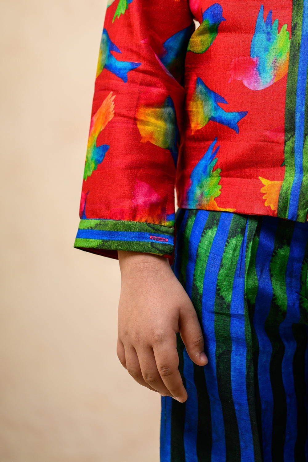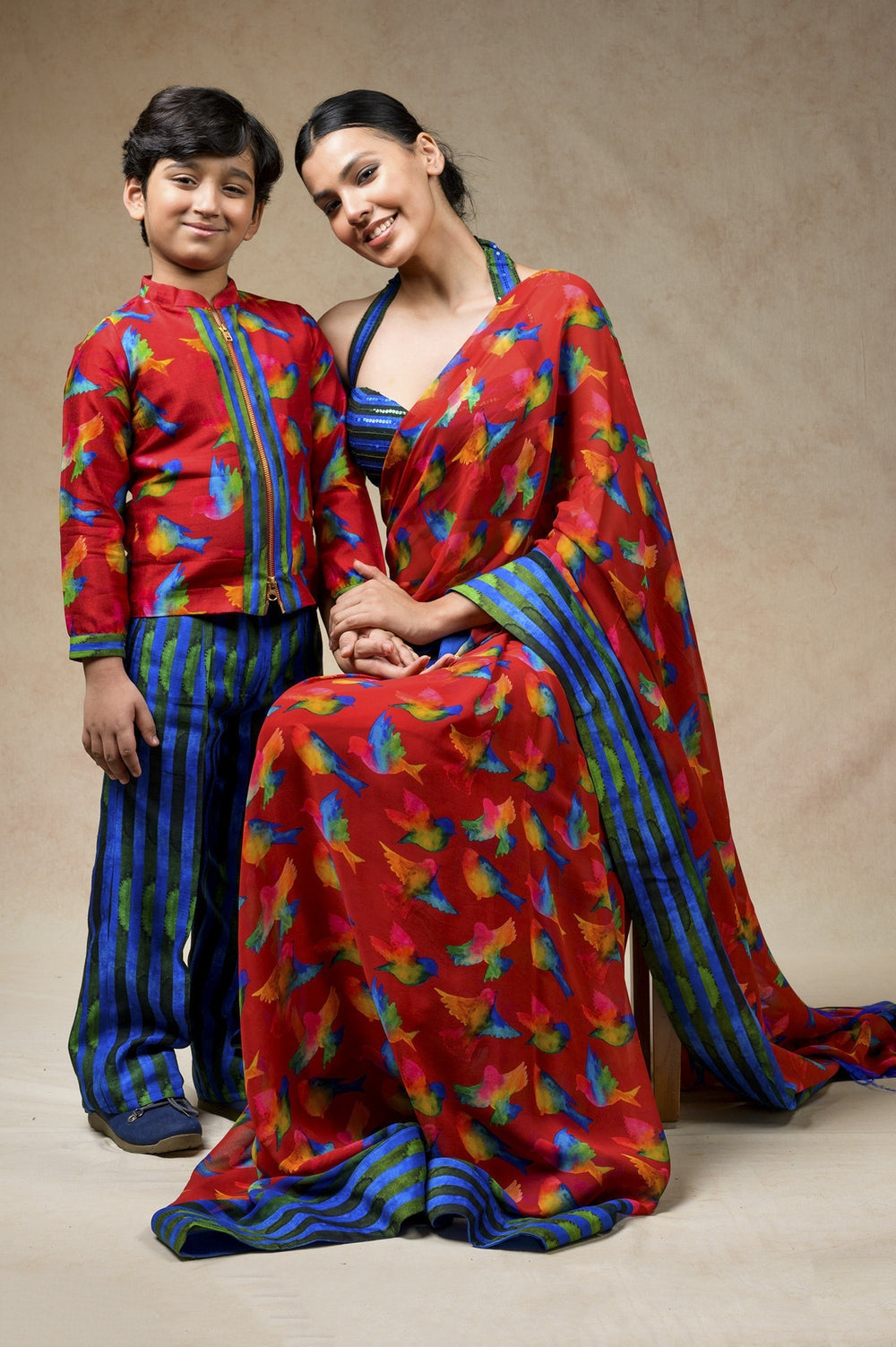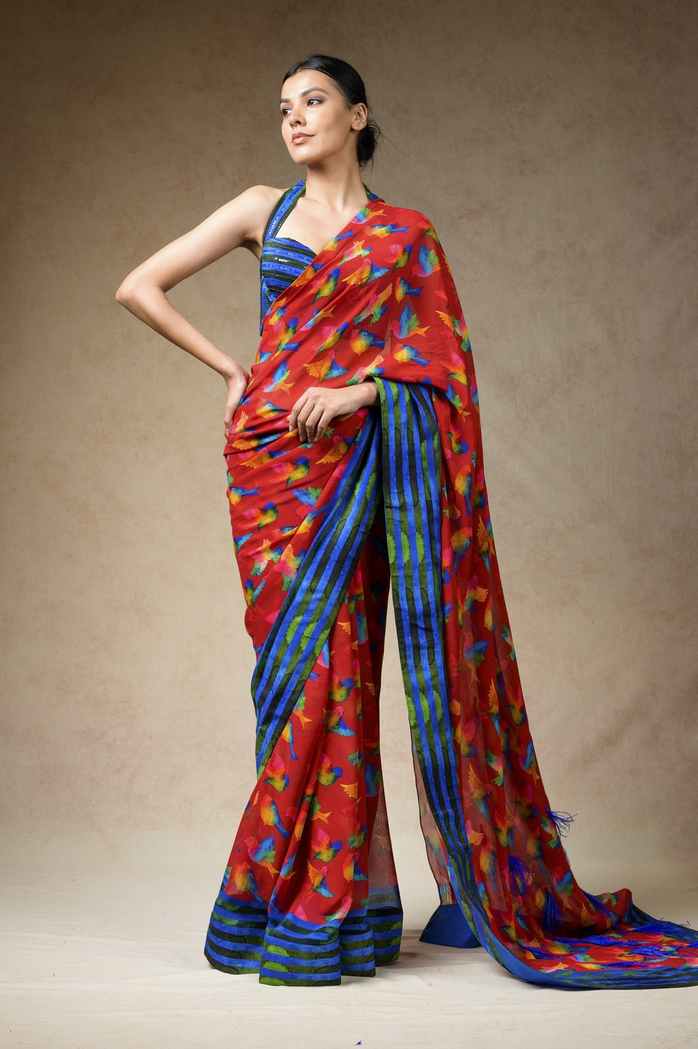 Beautiful birds printed (copyright print) saree in rich red color and stripes border