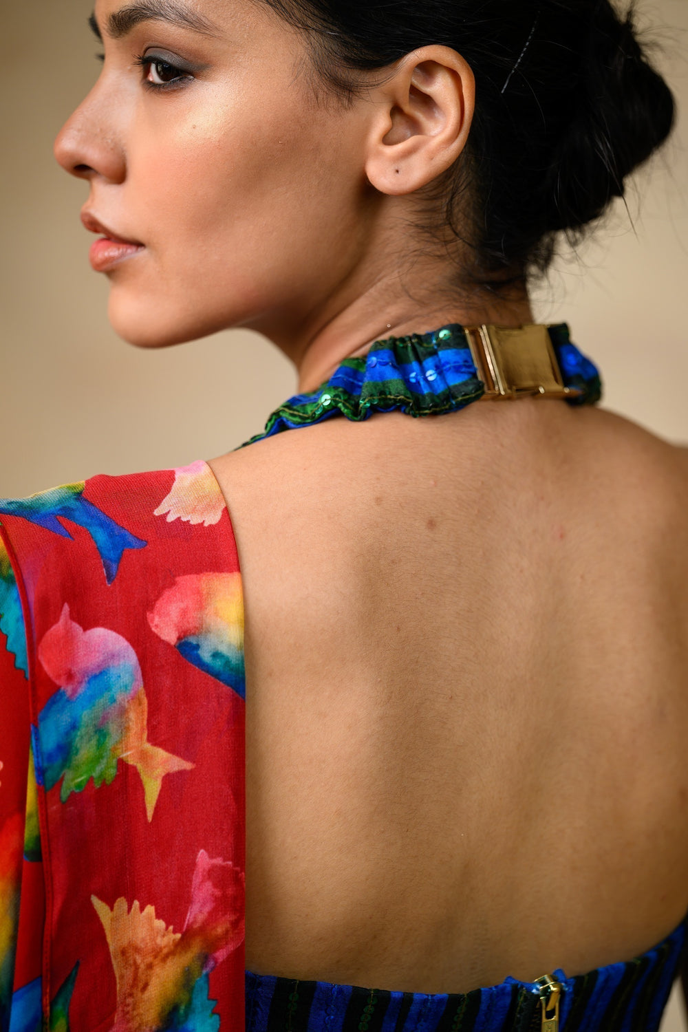 Hand embroidered halter neck blouse with back full YKK metal zipper in our stripes print (copyright)