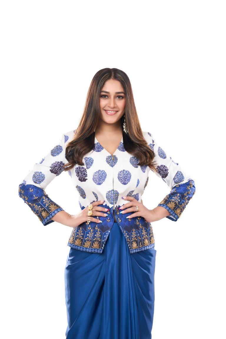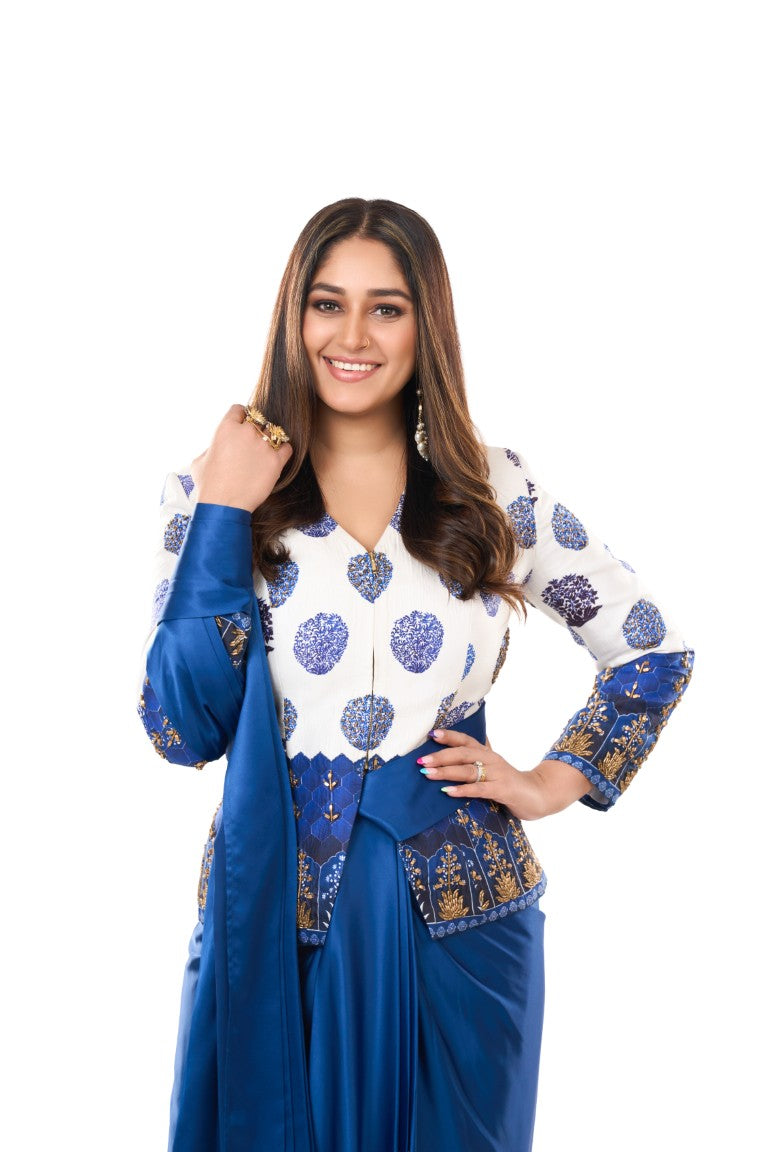 | Design Style | Hand-Embroidered Front Zipper Coat with Pre-Draped Blue Saree |